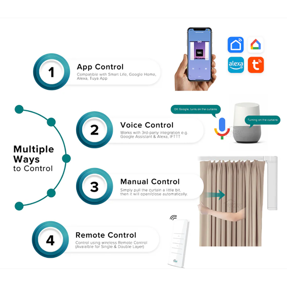 Our Smart Home system is the ideal solution for the modern home, offering a comprehensive IoT experience. With Wi-Fi and app integration with Smart Life, Tuya, Google Home and Amazon Alexa, you can control your curtains from anywhere. Enjoy the convenience of remote control using remote controllers, smartphones, or even voice control – no more manual operations!